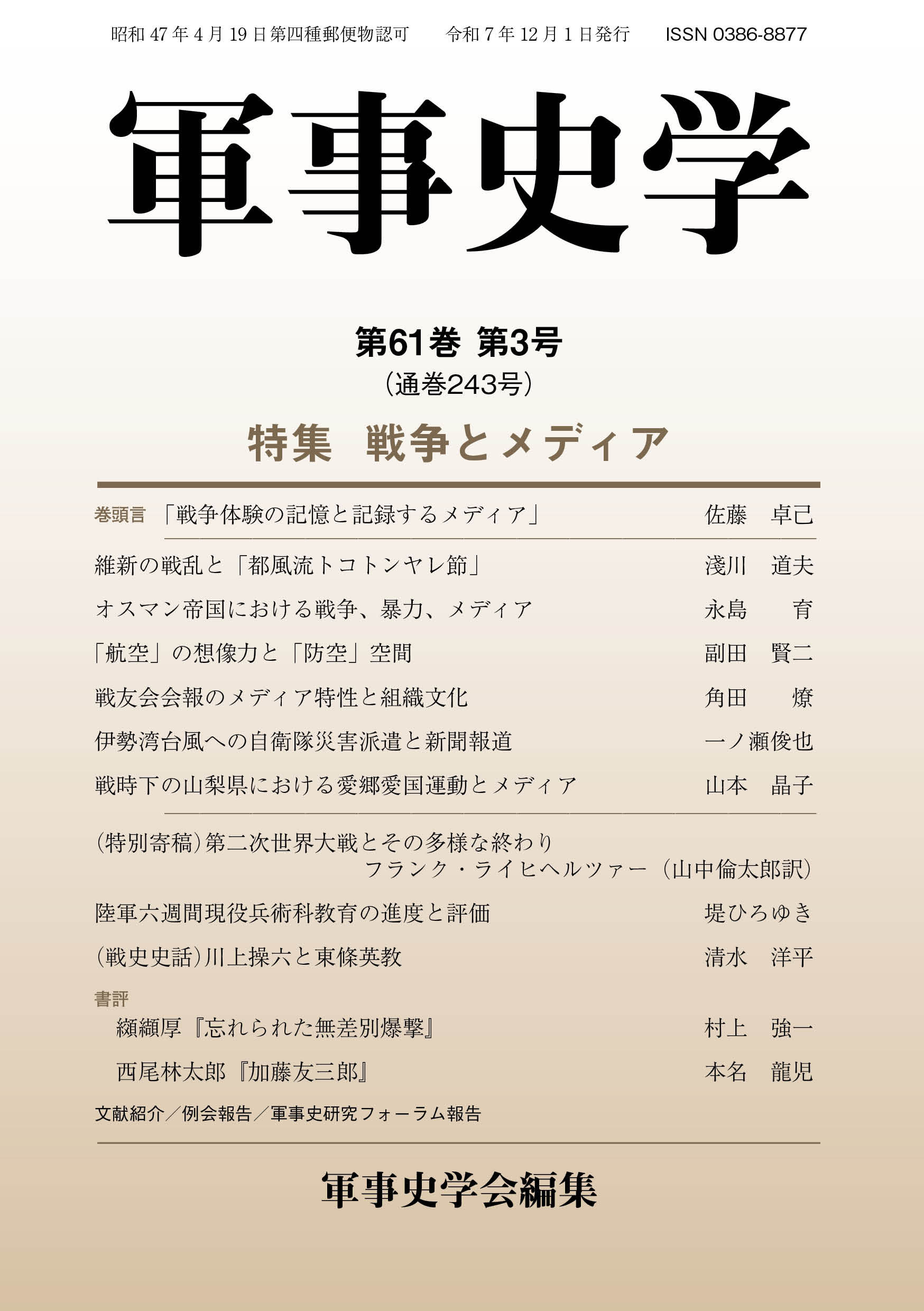| 《巻頭言》「戦争体験の記憶と記録するメディア」〔佐藤卓己〕 維新の戦乱と「都風流トコトンヤレ節」―いわゆる「官軍」によるプロパガンダ小考―〔淺川道夫〕 オスマン帝国における戦争、暴力、メディア―『軍部公報号外』を例に―〔永島育〕 「航空」の想像力と「防空」空間―一九三〇年代の大衆雑誌におけるイメージの分析を中心に―〔副田賢二〕 戦友会会報のメディア特性と組織文化―陸軍偕行社と海軍水交会の比較分析―〔角田燎〕 伊勢湾台風への自衛隊災害派遣と新聞報道〔一ノ瀬俊也〕 戦時下の山梨県における愛郷愛国運動とメディア―日独学徒大会をめぐる報道を中心として―〔山本晶子〕 《特別寄稿》第二次世界大戦とその多様な終わり―暴力の変容をグローバルな視点から考察する―〔フランク・ライヒヘルツァー〈山中倫太郎訳〉〕 陸軍六週間現役兵術科教育の進度と評価―新兵・初年兵教育との比較―〔堤ひろゆき〕 《戦史史話》川上操六と東條英教―久居駐屯地に残された書から―〔清水洋平〕 《書評》纐纈厚『忘れられた無差別爆撃―検証・錦州爆撃―』〔村上強一〕 《書評》西尾林太郎『加藤友三郎』〔本名龍児〕 文献紹介・例会報告・軍事史研究フォーラム報告 | |